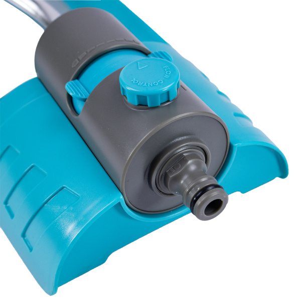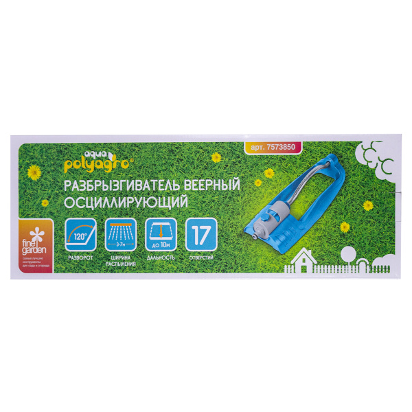 Для равномерного полива прямоугольной площади участка. Ширина распыления от 3 до 7 м, дальность до 10 м. Количество отверстий 17. Регулировка потока воды. Плавная регулировка наклона. Встроенный сеточный фильтр. Устойчивая конструкция разбрызгивателя. Металлический стержень распыления.