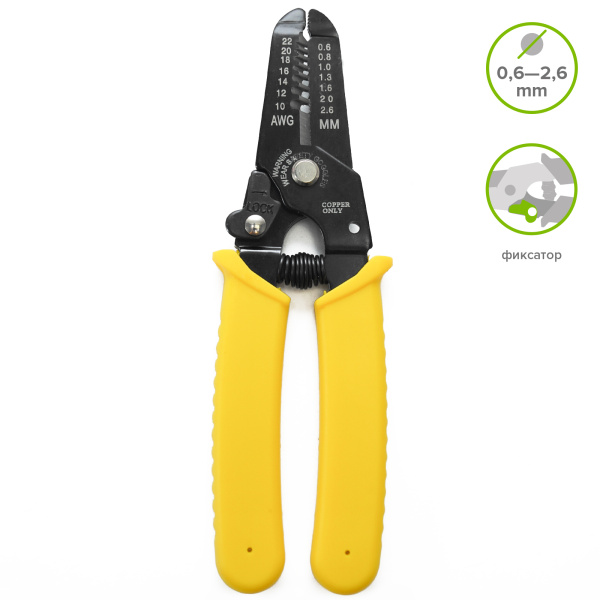 Используется для снятия изоляции с одножильных и многожильных проводов D = 0,6 - 2,6 мм. Изготовлены из инструментальной стали, пластиковые рукоятки.