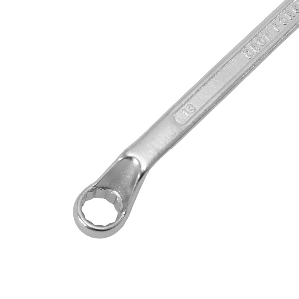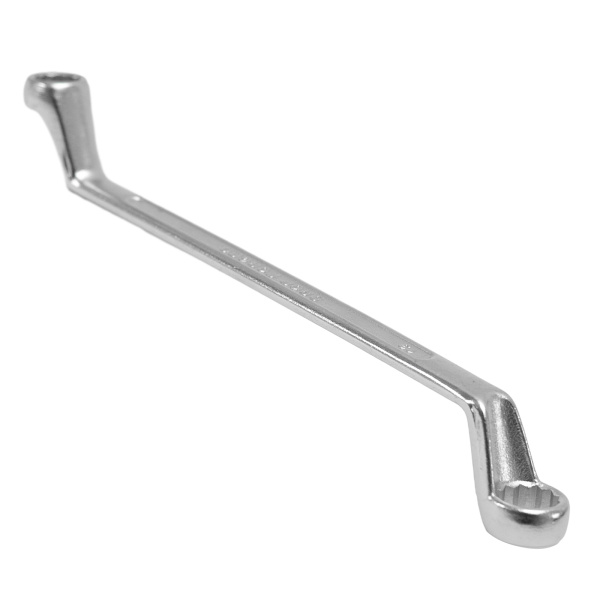 Упрочненная углеродистая сталь c хромированным покрытием, твёрдостью 45 HRс. Предназначен для закручивания и откручивания гаек, болтов и т.д. Ключ имеет 2 кольцевых зева разного размера.