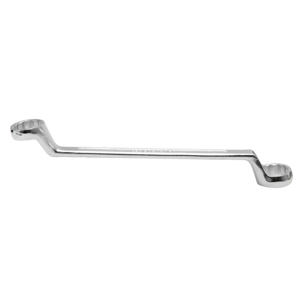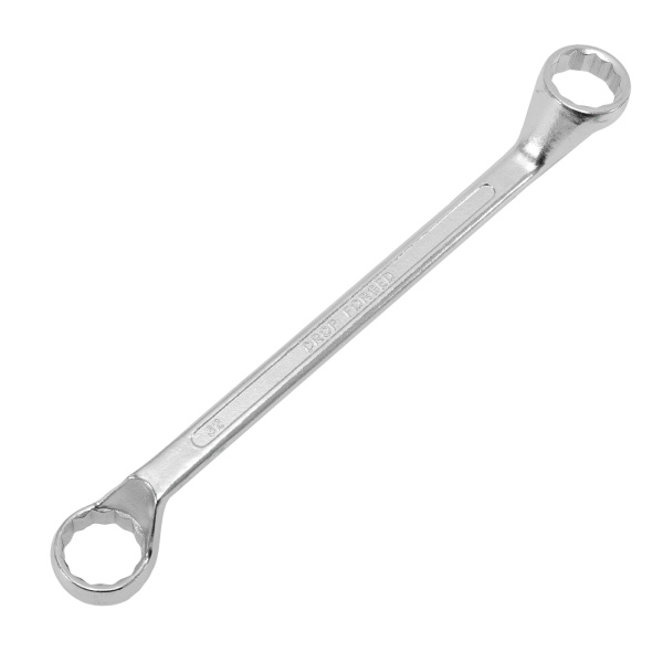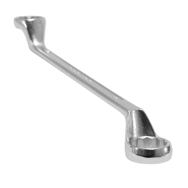 Упрочненная углеродистая сталь c хромированным покрытием, твёрдостью 45 HRс. Предназначен для закручивания и откручивания гаек, болтов и т.д. Ключ имеет 2 кольцевых зева разного размера.