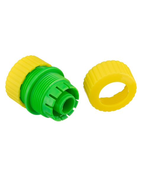 Из АБС-пластика.Применяется для быстрого и надежного соединения (удлинения) двух шлангов одинакового диаметра.