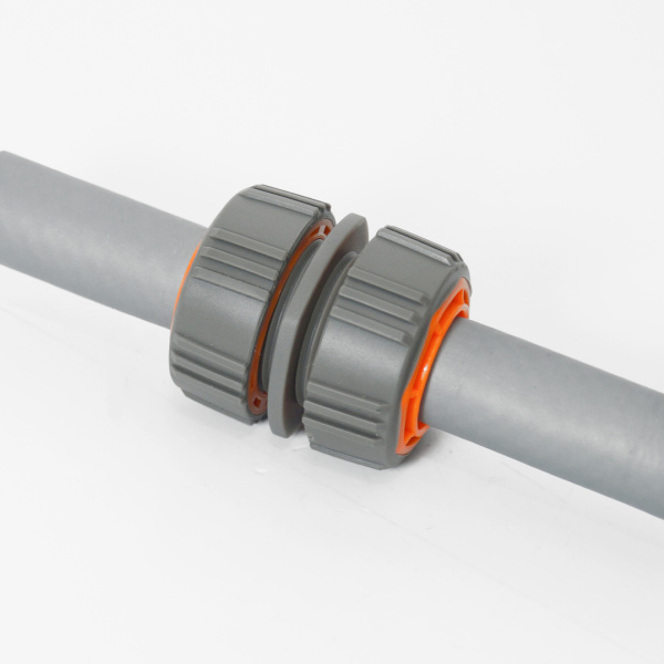 Из АБС-пластика.Применяется для быстрого и надежного соединения (удлинения) двух шлангов одинакового диаметра.