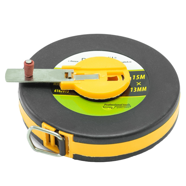Двухкомпонентный пластиковый корпус, фибергласовая лента с метрической шкалой. Цена деления – 1 мм. Катушечная ручка для сматывания, металлический зацеп-петля.