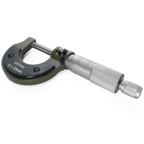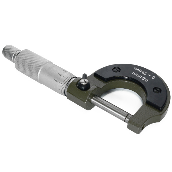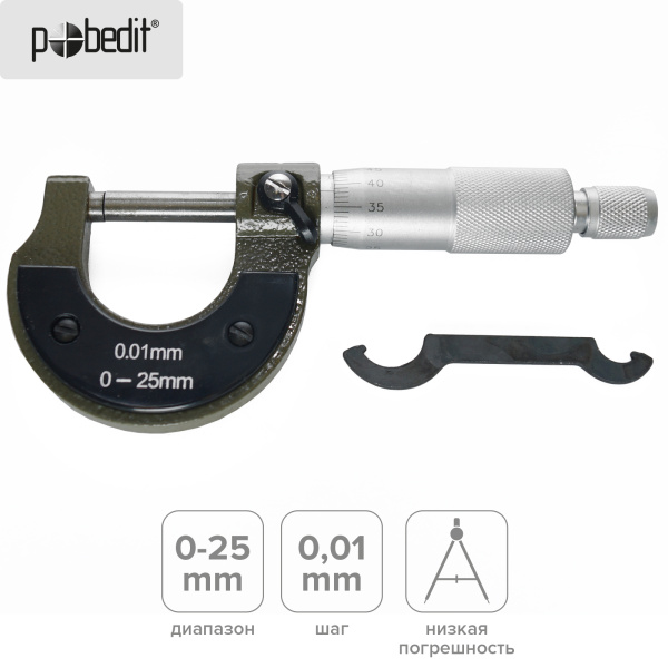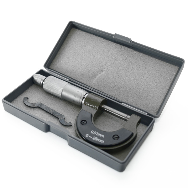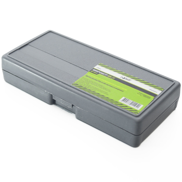 Инструментальная сталь. Имеет форму скобы. Основной рабочий элемент микрометрическая головка. Предназначен для точных измерений. Упакован в пластиковый бокс.
