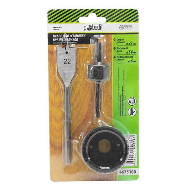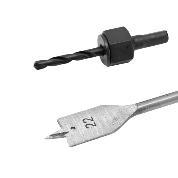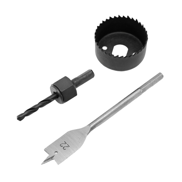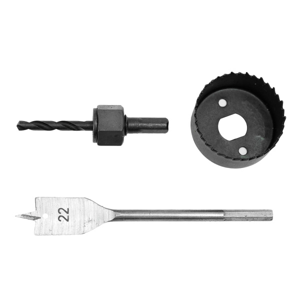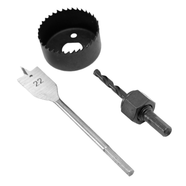 Углеродистая инструментальная сталь. Направляющее сверло 6 мм,перовое сверло 22 мм,кольцевая пила 54 мм.