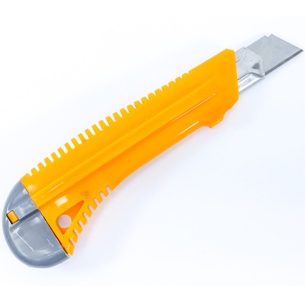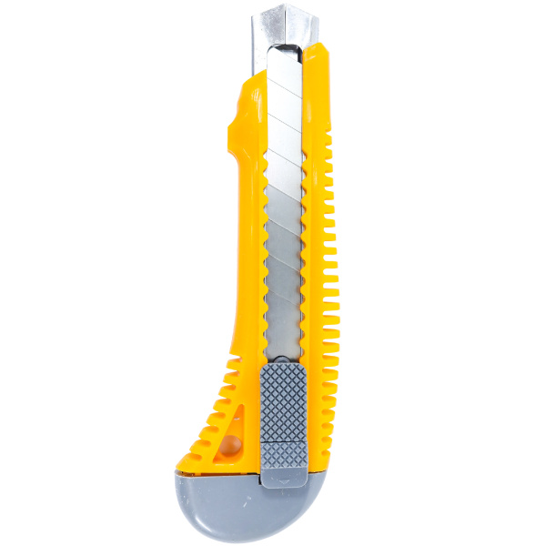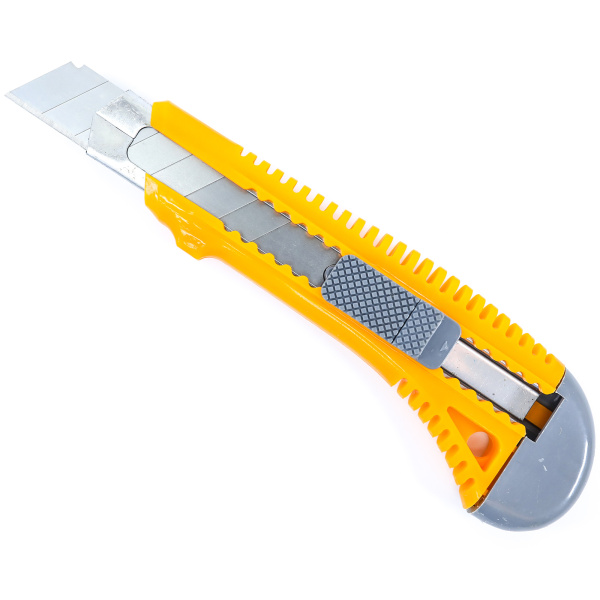 Пластиковый корпус с металлической направляющей, кнопка выдвижения и фиксации лезвия. Лезвие на 7 сегментов.