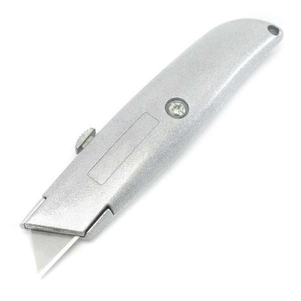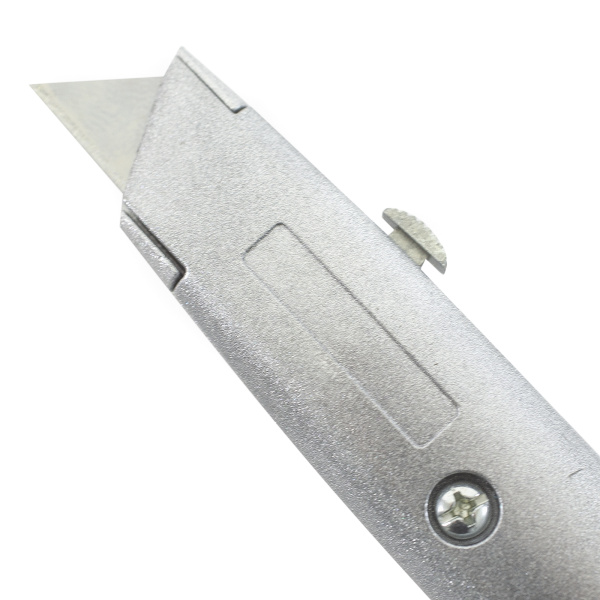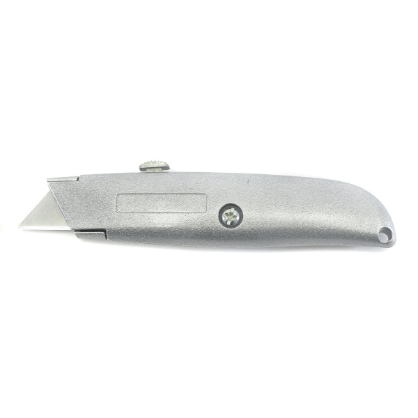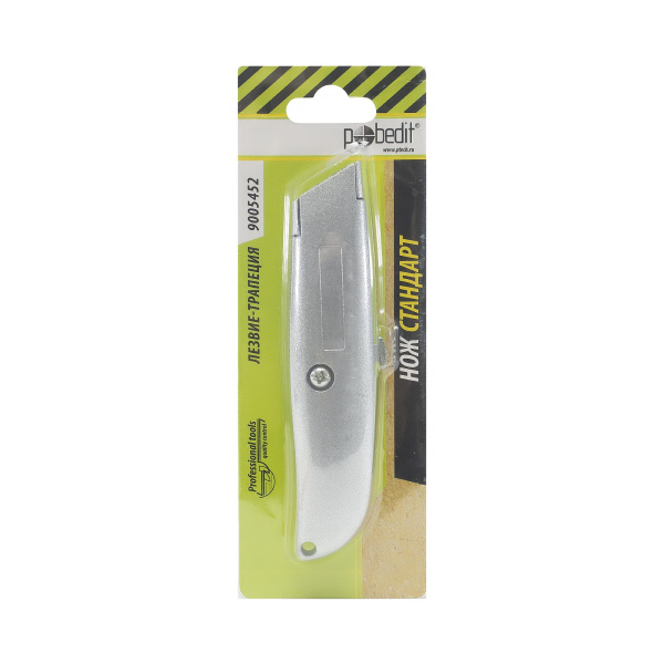 Металлический корпус, выдвижное трапециевидное лезвие. Автоматическая фиксация лезвия.