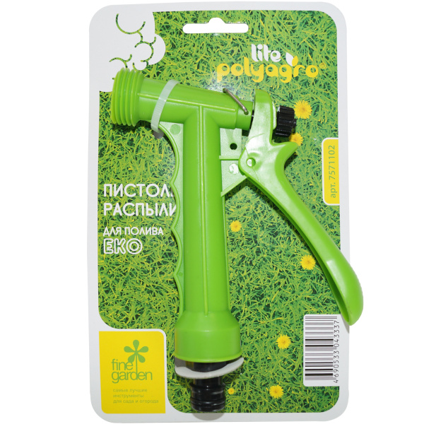 Серия EKO. Со штуцерной посадкой и удобным курком. Предназначен для полива на дачных участках, в садах. Оснащён фиксатором курка для непрерывной работы. Изготовлен из прочного АБС-пластика.