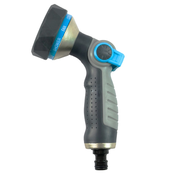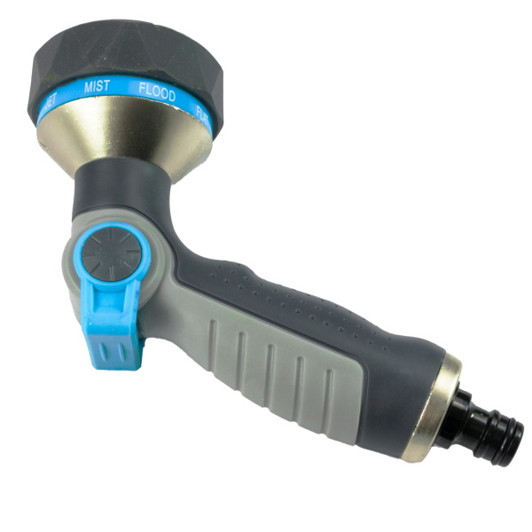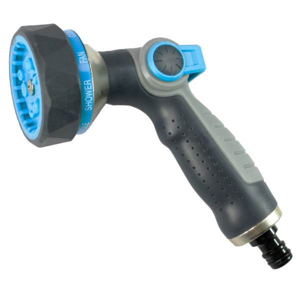 Предназначен для полива растений, имеет штуцерную посадку для подключения шланга через быстросъёмный соединитель, и спуск воды с регулятором и фиксатором напора. Форсунка имеет 9 режимов полива. Металлический обрезиненный корпус. Плавная регулировка подачи воды одним большим пальцем.