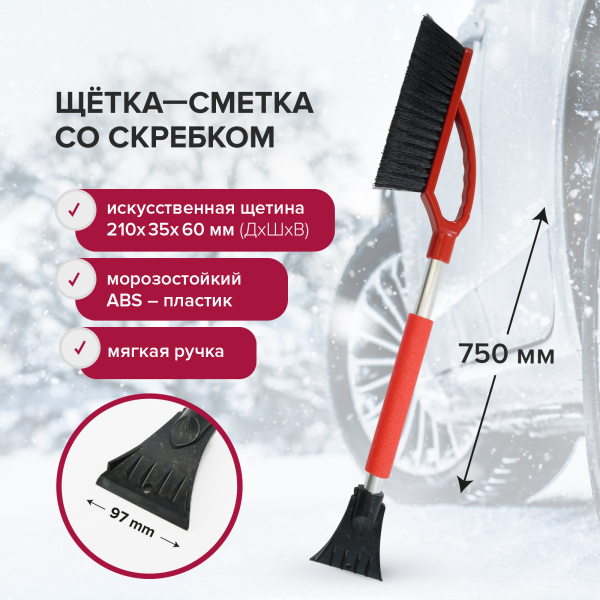 Алюминиевая ручка с мягкой накладкой, скребок из морозостойкого пластика, искуственная щетина. Применяется для удаления снега и льда.