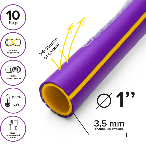 Предназначен для полива и перекачки жидкостей. Обладает высокой прочностью, гибкостью и устойчивостью к перепадам температур (-50 до +90). Оптимальное рабочее давление 10 бар.