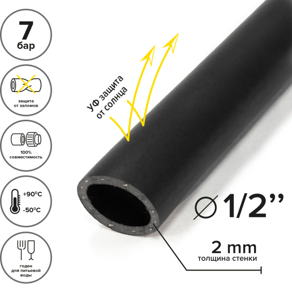 Предназначен для полива и перекачки жидкостей. Обладает высокой прочностью, гибкостью и устойчивостью к перепадам температур (-50 до +90). Оптимальное рабочее давление 7 бар.