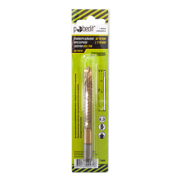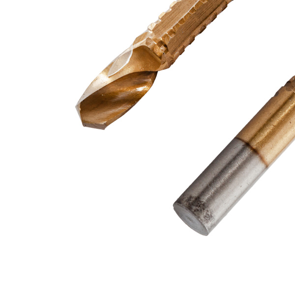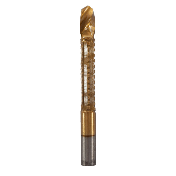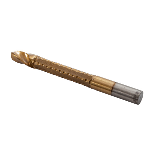 Инструментальная легированная сталь, нитрид-титановое покрытие. Для сверления с последующим фрезерованием листовых материалов