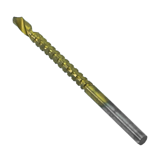 Инструментальная легированная сталь, нитрид-титановое покрытие. Для сверления с последующим фрезерованием листовых материалов