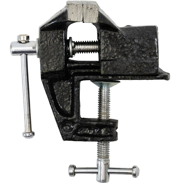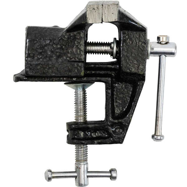 Тиски настольные, предназначены для фиксации мелких заготовок для дальнейшей слесарной обработки, изготовлены из чугуна, рабочие губки из стали твёрдость 45 HRс.