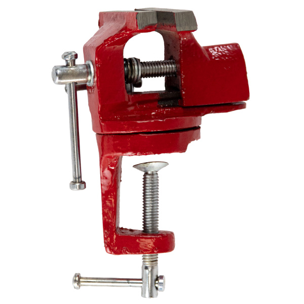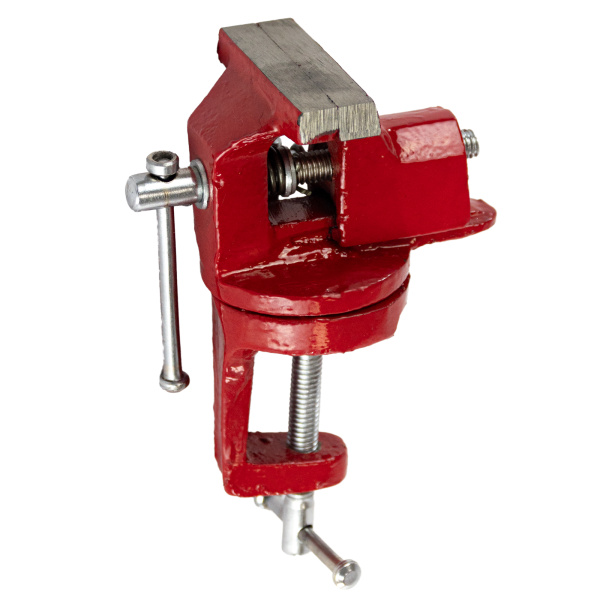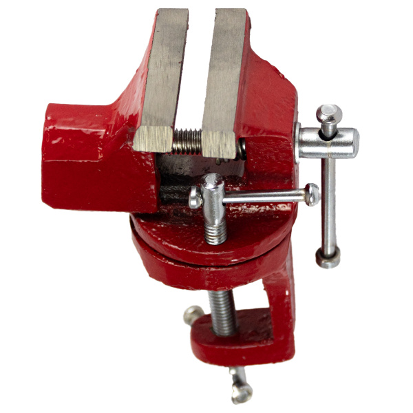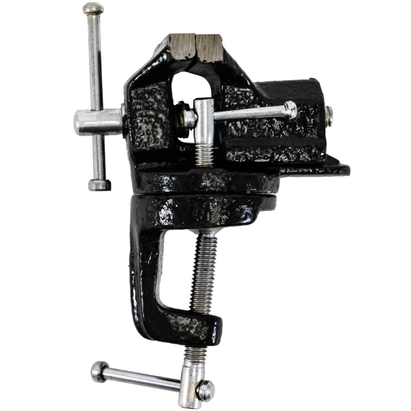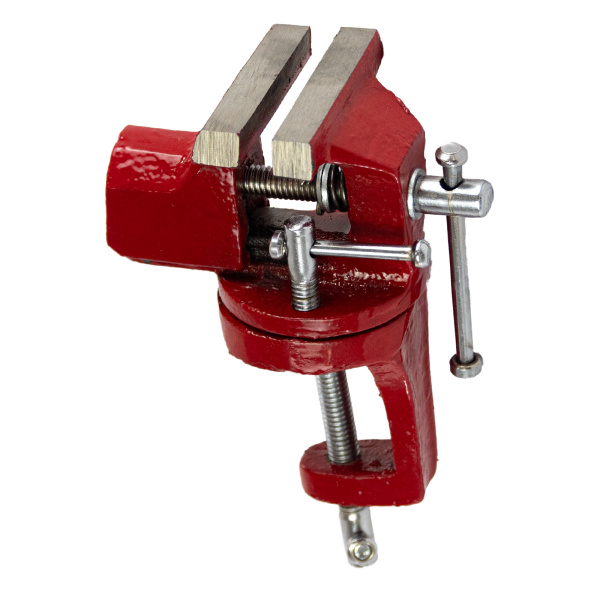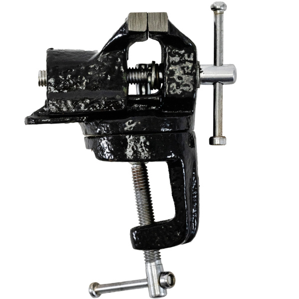 Тиски настольные, предназначены для фиксации мелких заготовок для дальнейшей слесарной обработки, изготовлены из чугуна, рабочие губки из стали твёрдость 45 HRс. Оснащены поворотным механизмом.