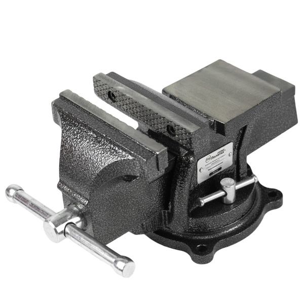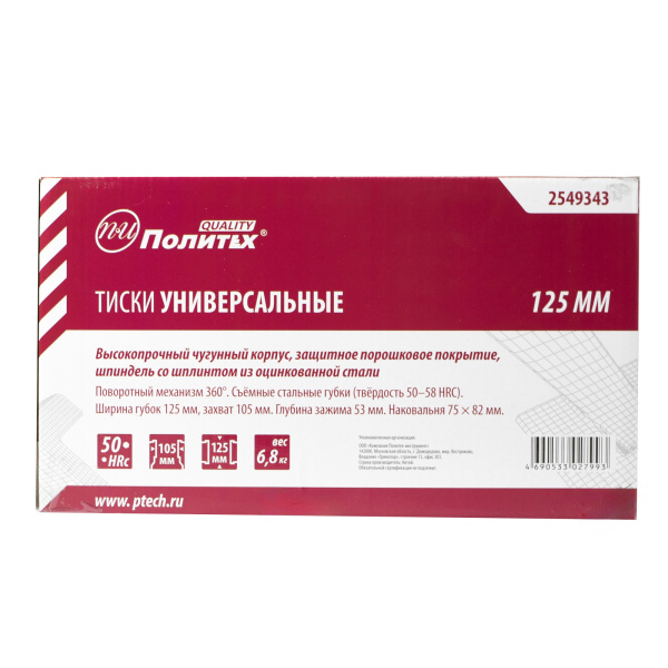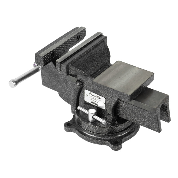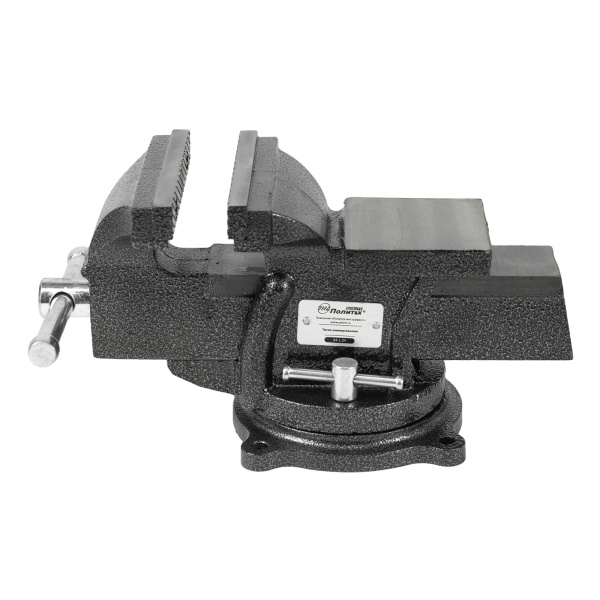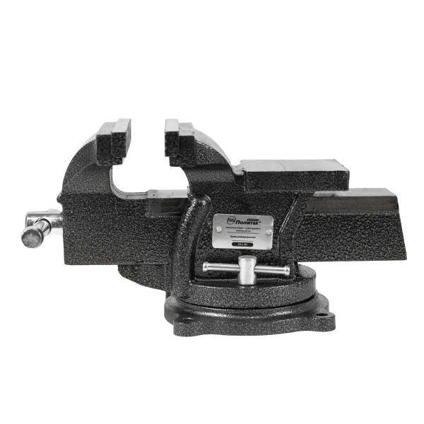Имеют высокопрочный чугунный корпус, защитное порошковое покрытие, шпиндель со шплинтом из оцинкованной стали. Поворотный механизм 360°. Съемные стальные губки (твердость 50-58 HRC). Ширина губок: 125 мм, захват: 105 мм. Глубина зажима: 53 мм. Наковальня 75х82 мм.