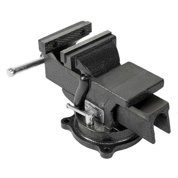 Имеют высокопрочный чугунный корпус, защитное порошковое покрытие, шпиндель со шплинтом из оцинкованной стали. Поворотный механизм 360°. Съемные стальные губки (твердость 50-58 HRC). Ширина губок: 100 мм, захват: 105 мм. Глубина зажима: 53 мм. Наковальня 75х82 мм