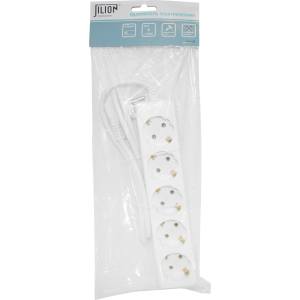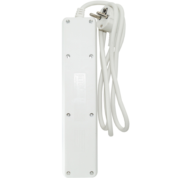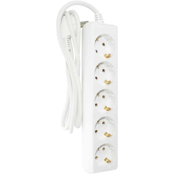 Удлинитель 5 гнезд с заземлением, максимальная мощность 2300 Вт, номинальный ток 10 А, сечение кабеля 0,75 мм2.
