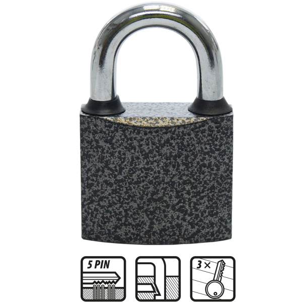 Высокопрочный корпус и стальная закаленная дужка .В комплекте 3 ключа.